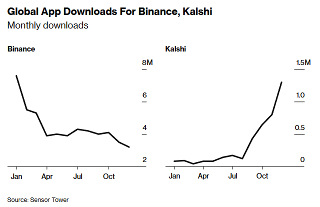 这种变化也体现在数据上。去年,加密交易所应用的下载量大幅下滑,而预测市场却走向了相反的方向。根据市场情报公司Sensor Tower的数据,Polymarket的安装量从去年1月的3万次攀升至去年12月的40多万次;Kalshi的安装量在同一时期从8万次暴涨至130万次。与此同时,全球最大的加密交易所币安的下载量则减少了一半以上。